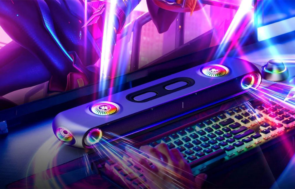 • 在前方、上方及左右兩瑞均有升壓渦型發聲單元更配以「龍捲風旋轉」反應式遊戲 RGB 燈,會跟隨遊戲變化而改變色調和閃爍率,令你戰意十足