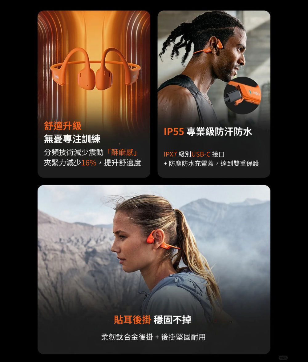 • 憑藉IPX7級USB-C接口和防塵防水充電蓋,OpenRun Pro 2 提供了雙重保護,為使用者帶來更加安心的使用體驗