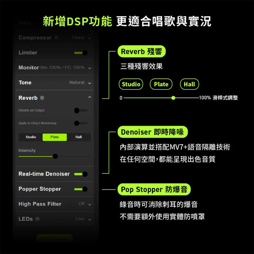 - 提供三種不同的混響(Reverb) 設定: Plate、Hall以及Studio。您更可調較效果的強度,以令錄音達至理想的深度和豐富度