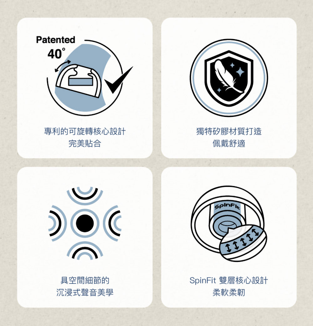 管芯 SpinFit Logo 印刷,設計與功能兼具,是 SpinFit 對使用者聆聽的品質保證